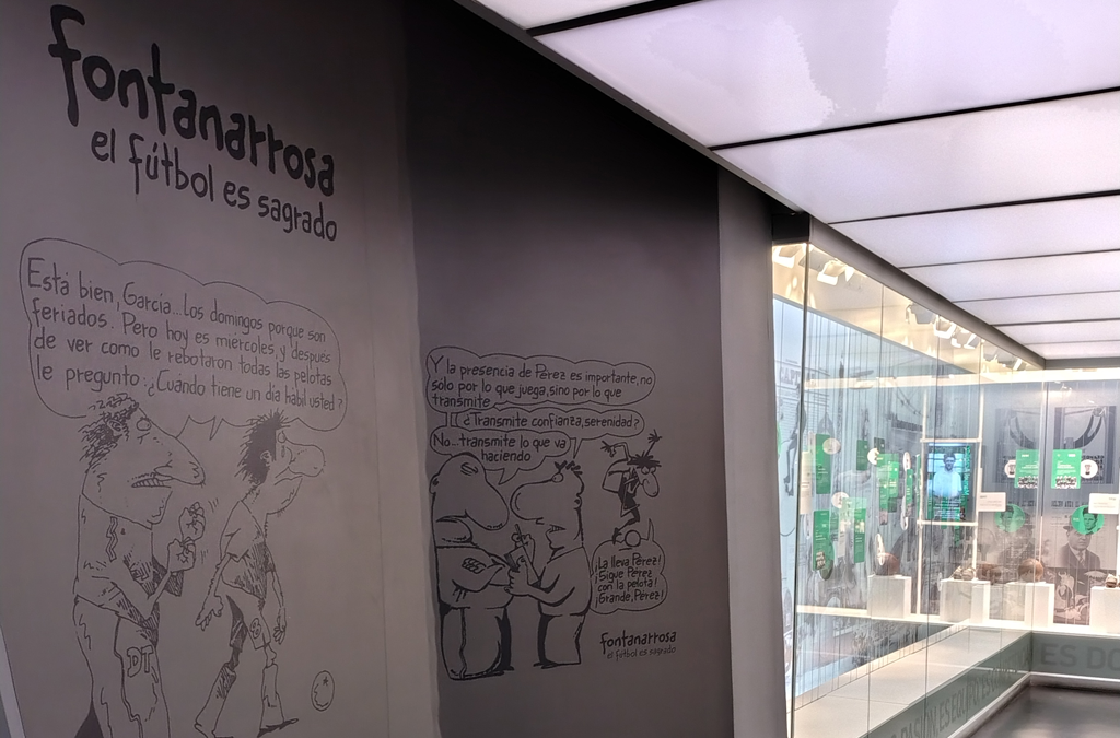 Hoy se conmemora un nuevo aniversario del nacimiento del escritor y humorista rosarino nacido un 26 de noviembre de 1944. En el ingreso del sector fútbol, dos ilustraciones resaltan la sagacidad del ilustrador sobre una de sus grandes pasiones, el fútbol.
